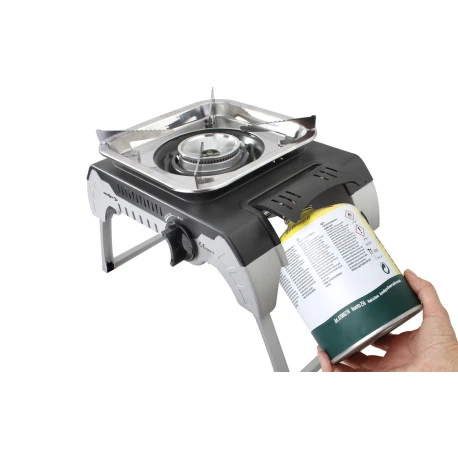 Fornello a gas portatile in accaio inox, con gambe pieghevoli.Â